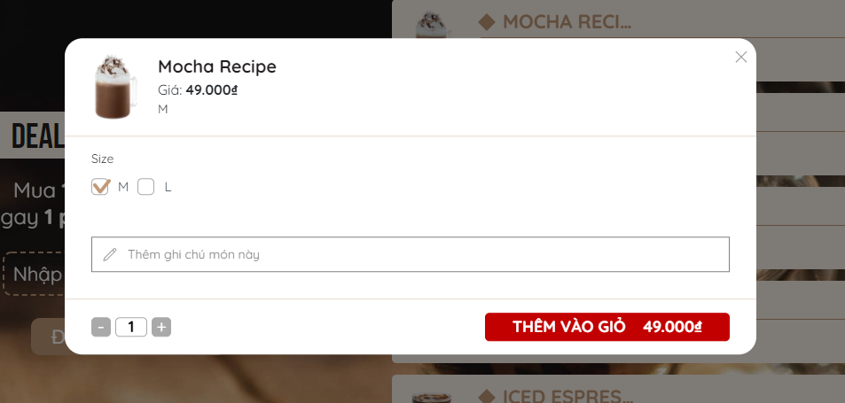 Tại Popup đặt món khách hàng có thể tùy chọn kích cỡ đồ uống, topping, số lượng và ghi chú riêng cho cửa hàng. Chủ quán cũng có thể linh động điều chỉnh các trường lựa chọn trong popup đặt món để phù hợp với từng loại đồ uống. Ngoài ra, chủ quán cũng có thể thêm mô tả cho các món tại cửa hàng để khách hàng không mất thời gian tìm hiểu khi vào website.