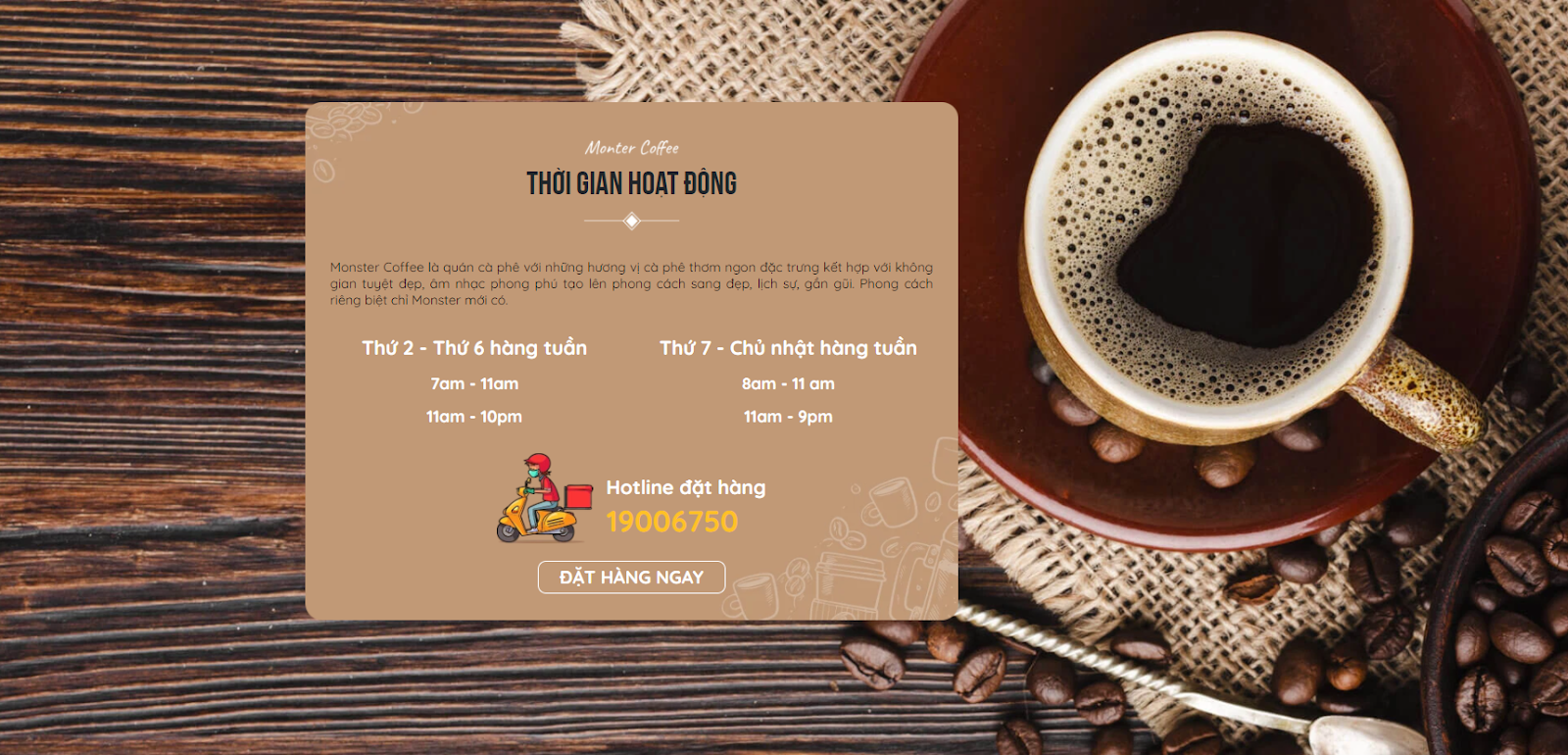 Module thời gian hoạt động giúp bạn đưa ra thông tin thời gian hoạt động của cửa hàng một cách chính xác nhất. Khách hàng khi ghé thăm website bán hàng Monster Coffee nếu có nhu cầu đặt hàng sẽ chủ động hơn về mặt thời gian, chủ cửa hàng cũng không cần mất công sức thông báo với khách hàng về thời gian đóng – mở cửa hàng.